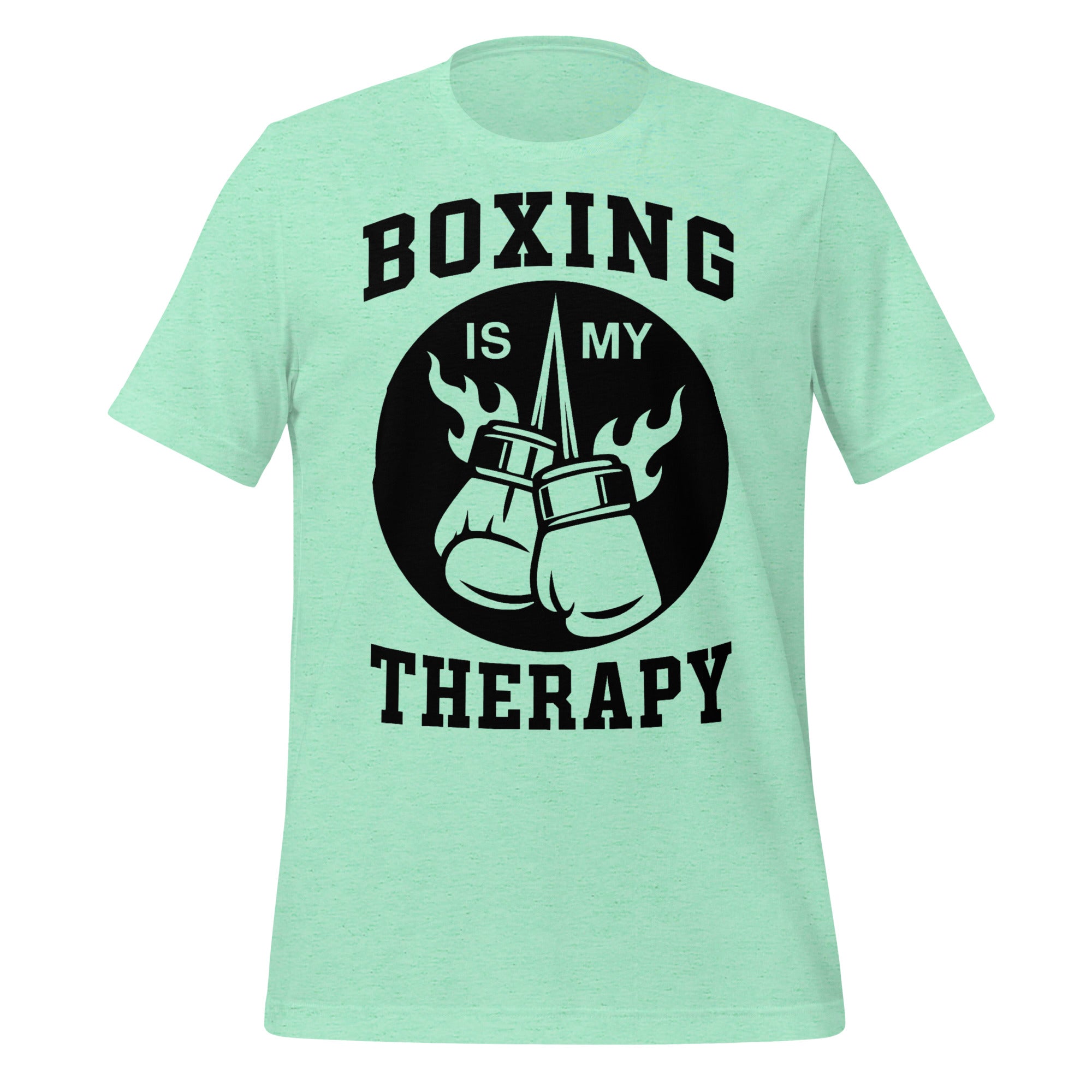 Green t-shirt with 'Boxing is my Therapy' graphic on a white background